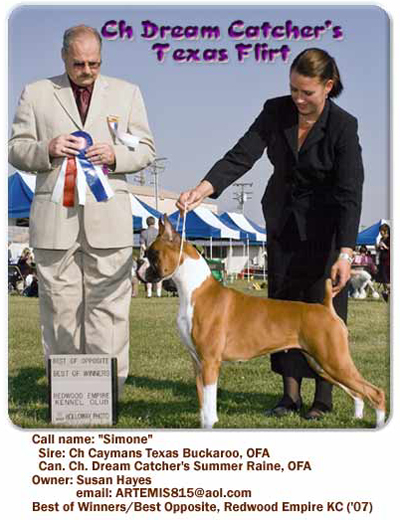 receiving his Championship on Buckaroo not only won Winners Dog, Best of Winners and a 4 point Major, he also won Best of Breed over an Entry of 62 Boxers and Top winning specials! Handled by Sonda Peterson, Buckaroo also has the honor of making his Sire a Sire of Merit. Sire of: Can Ch Dream Catcher's Texas Flirt |