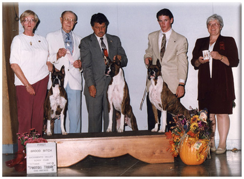 ![]() As Fancy neared her 5th birthday, she took 1st Place for Brood Bitch at the Sacramento Boxer Club Specialty in Dixon, CA. My thanks to Judge Jack A Dexter. Her produce are (Ch) Caymans Nightrider with Gary Steele and (Ch) Caymans Sweet Georgia Brown with Paul Catterson. October 24, 1997.