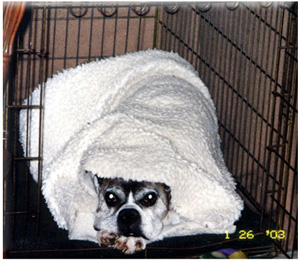 After Scott's death, it was only a natural progression for Fancy to sleep in her father's crate in the kitchen. A "cocooner" since she was a baby, she loved to snuggle deep inside her blankets. |